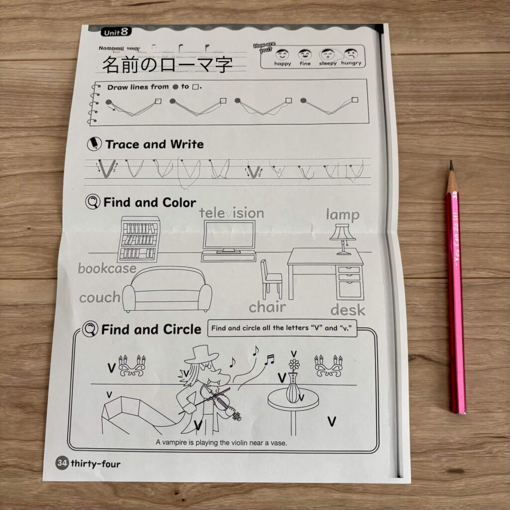 - テキストブック:自分の名前やアルファベットのなぞり書きなど、ライティングの練習。