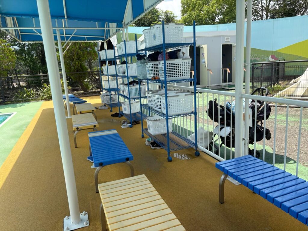 プールサイドに荷物を置く棚があるので、施設内のカゴを利用し、そこに入れる感じです。