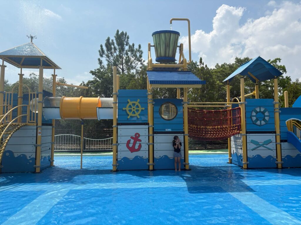 ・浅いプールの中に遊具があって、滑り台やアスレチックネットで遊べるようになっています。